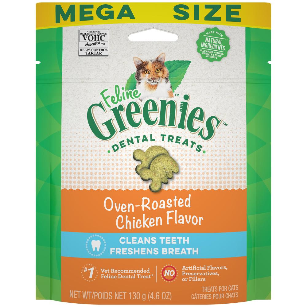 FELINE GREENIES Oven Roasted Chicken Flavor Dental Cat Treats were designed to help keep your cat?s teeth clean and healthy. The crunchy texture of these irresistible cat snacks helps clean teeth, reduce tartar buildup, and freshen cat breath, letting you enjoy cuddle time even more. Made with natural ingredients plus vitamins, minerals, and other nutrients, these tasty natural dental treats are nutritionally complete and balanced for adult cats. Plus, FELINE GREENIES Dental Treats contain less than 2 calories per treat and are the #1 vet recommended feline dental treat.* For some healthy play, try placing a few cat treats inside a treat dispenser toy and watch your cat chase and swat away. Give your cat FELINE GREENIES Dental Treats, and you're sure to hear happy purrs of joy. FELINE GREENIES Daily Dental Treats... for healthy and happy dental care.* Among U.S. veterinarians who recommend dental treats for at-home oral care